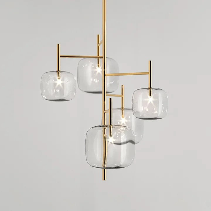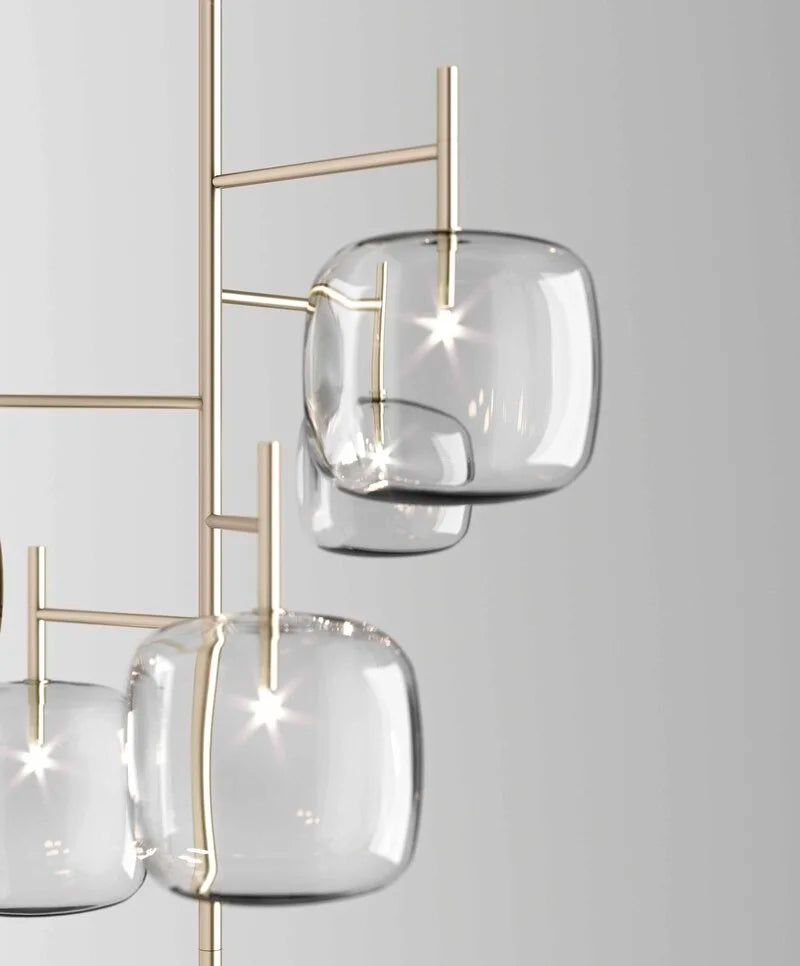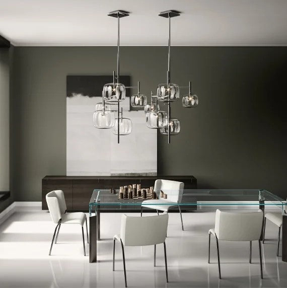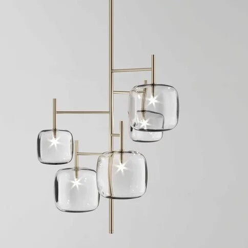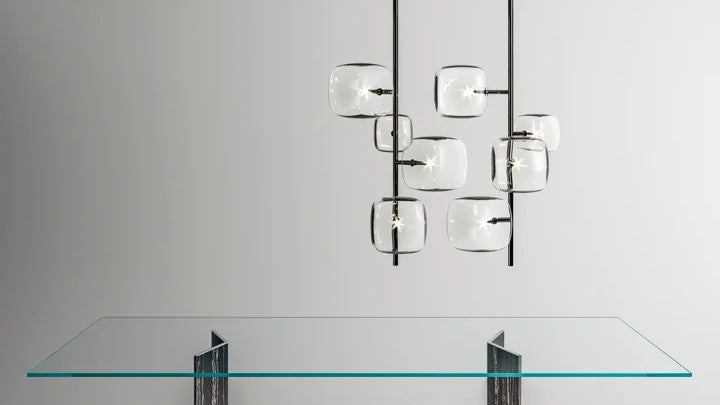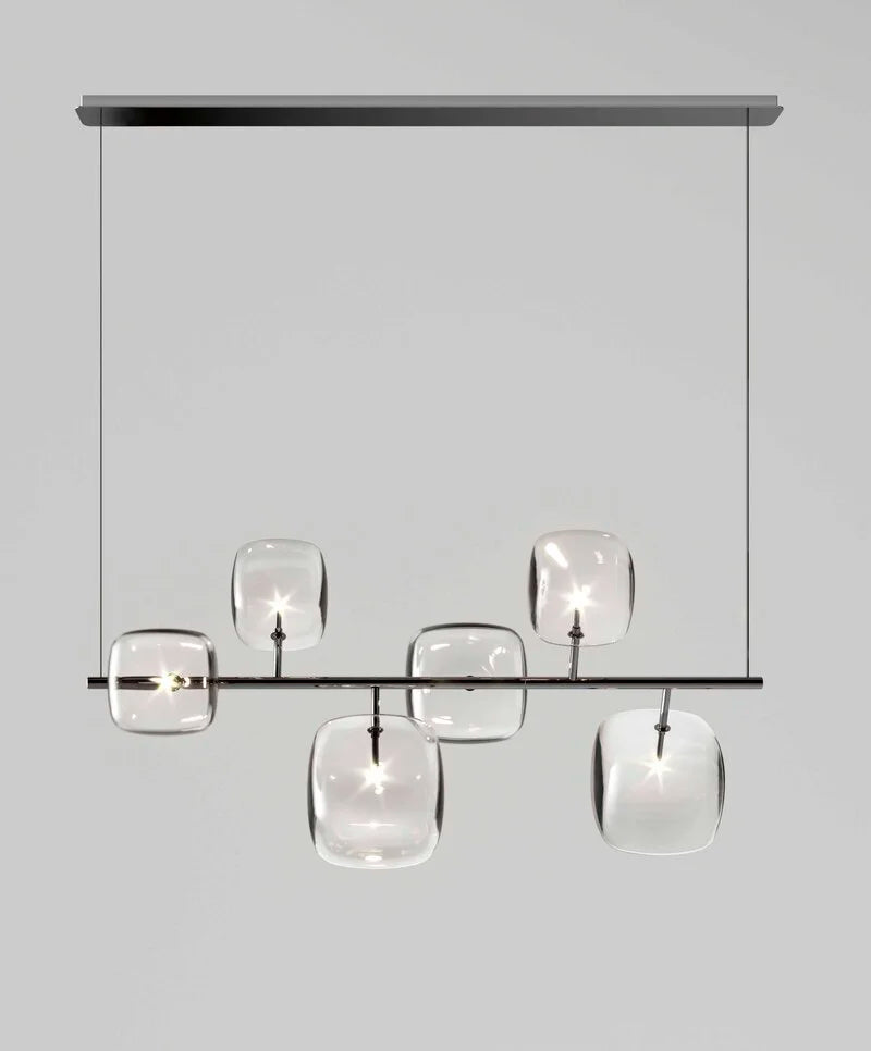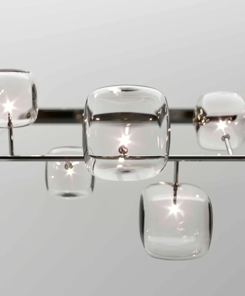Hyperion is defined by balance and visual clarity. Transparent, rounded cubic forms appear to float in space, creating a quiet yet powerful presence. Whether installed as a single statement or as a multi-drop composition at varied heights, Hyperion enhances luxury environments with a sense of order, lightness, and modern elegance.