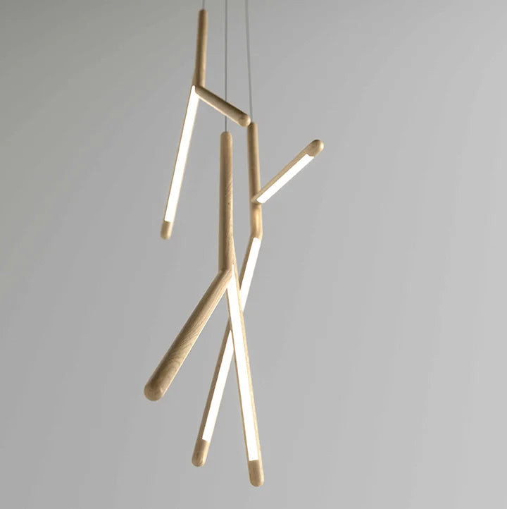 Lifestyle imagery suggestion: clusters of multiple Noum lamps in a high-ceiling living area or gallery, showing interplay of light, shadow, and the fluid wood structure. Close-ups of wood grain and asymmetric lines to emphasize craftsmanship.