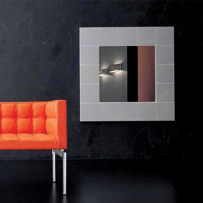 Alivar Quadrus Standing Mirror can be positioned slanting against a wall or fixed to a wall vertically or horizontally. Alivar Quadrus contemporary mirror is composed of a white wooden backing panel and squares in sheetmetal at 1 cm. gaps. Customize with lacquered white or embossed aluminum squares as shown in detail.
