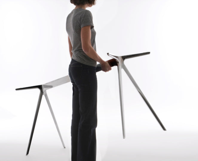 • Finish variations: polished aluminum or painted legs/crosspiece; black or white base