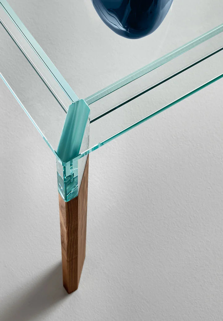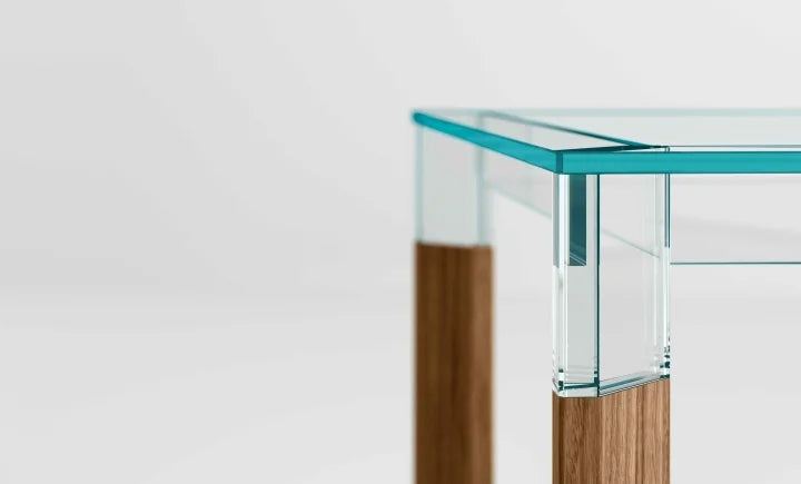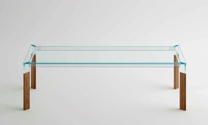 Elevate your dining experience with a piece that marries transparent sophistication and natural warmth, designed for the discerning home.
