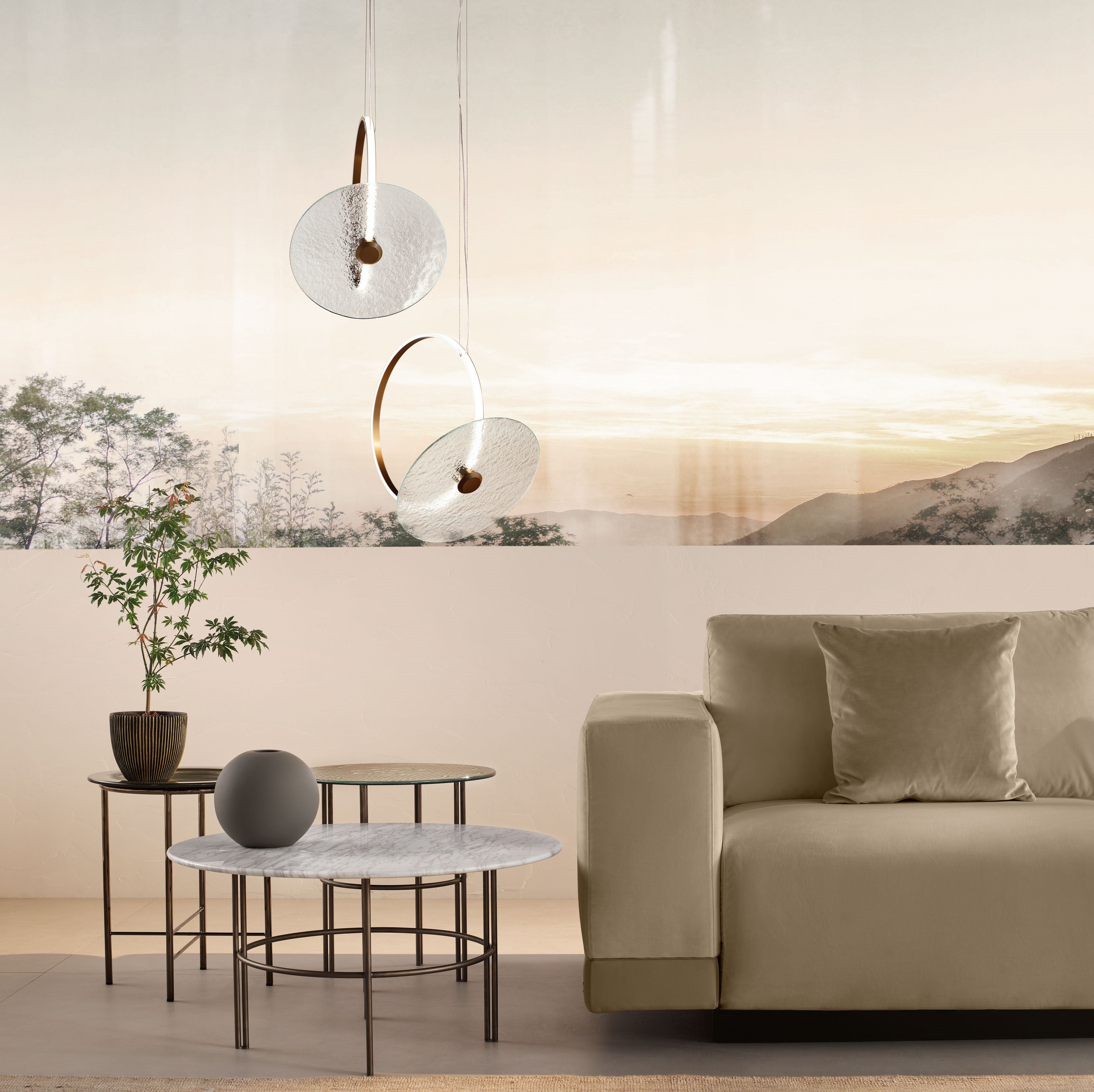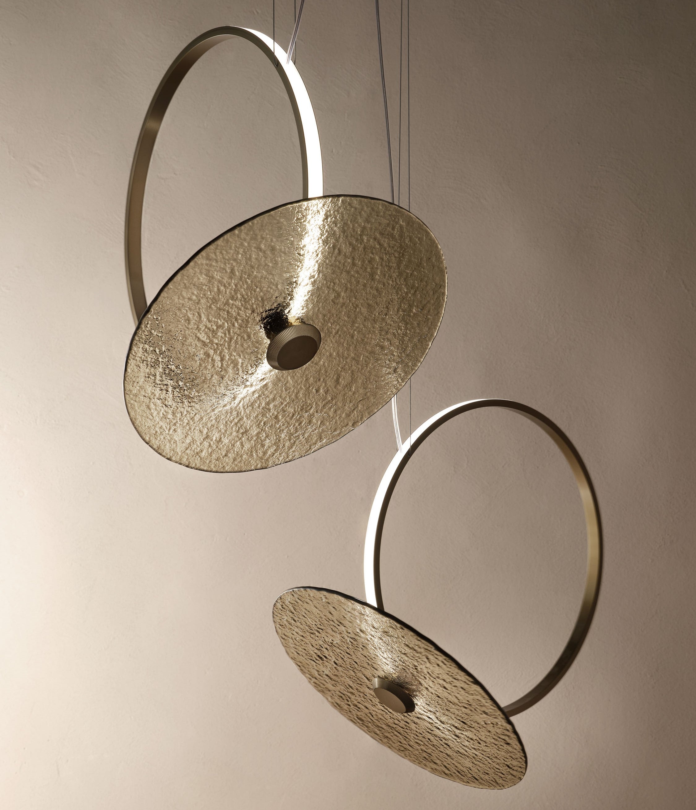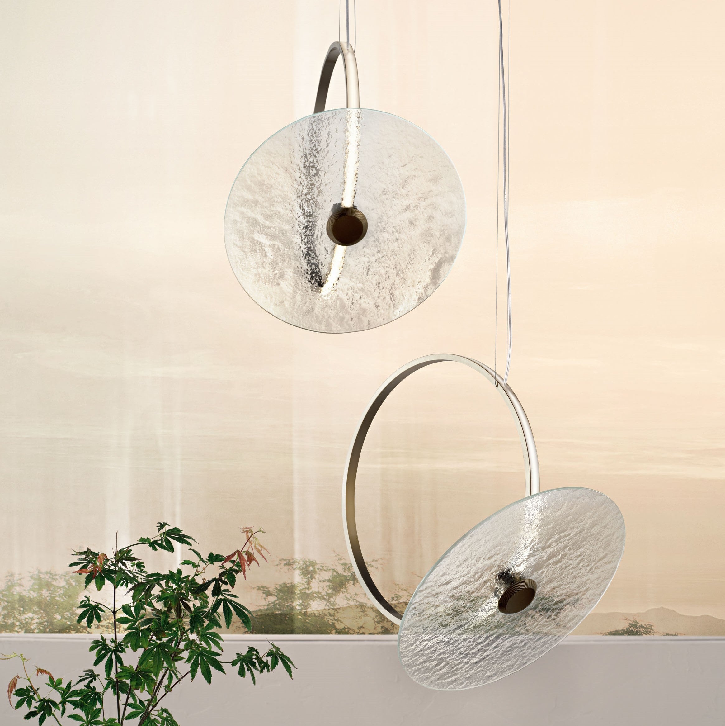Designed by Davide Oppizzi for FIAM, Marry Me is conceived as a luminous composition rather than a conventional lamp. A suspended ring of light frames a hand-fused glass diffuser, creating a sense of motion, depth, and softness. Whether placed above a dining table, in a double-height living space, or as a dramatic focal point in a bedroom or lobby, Marry Me introduces a subtle theatricality rooted in contemporary Italian design.
