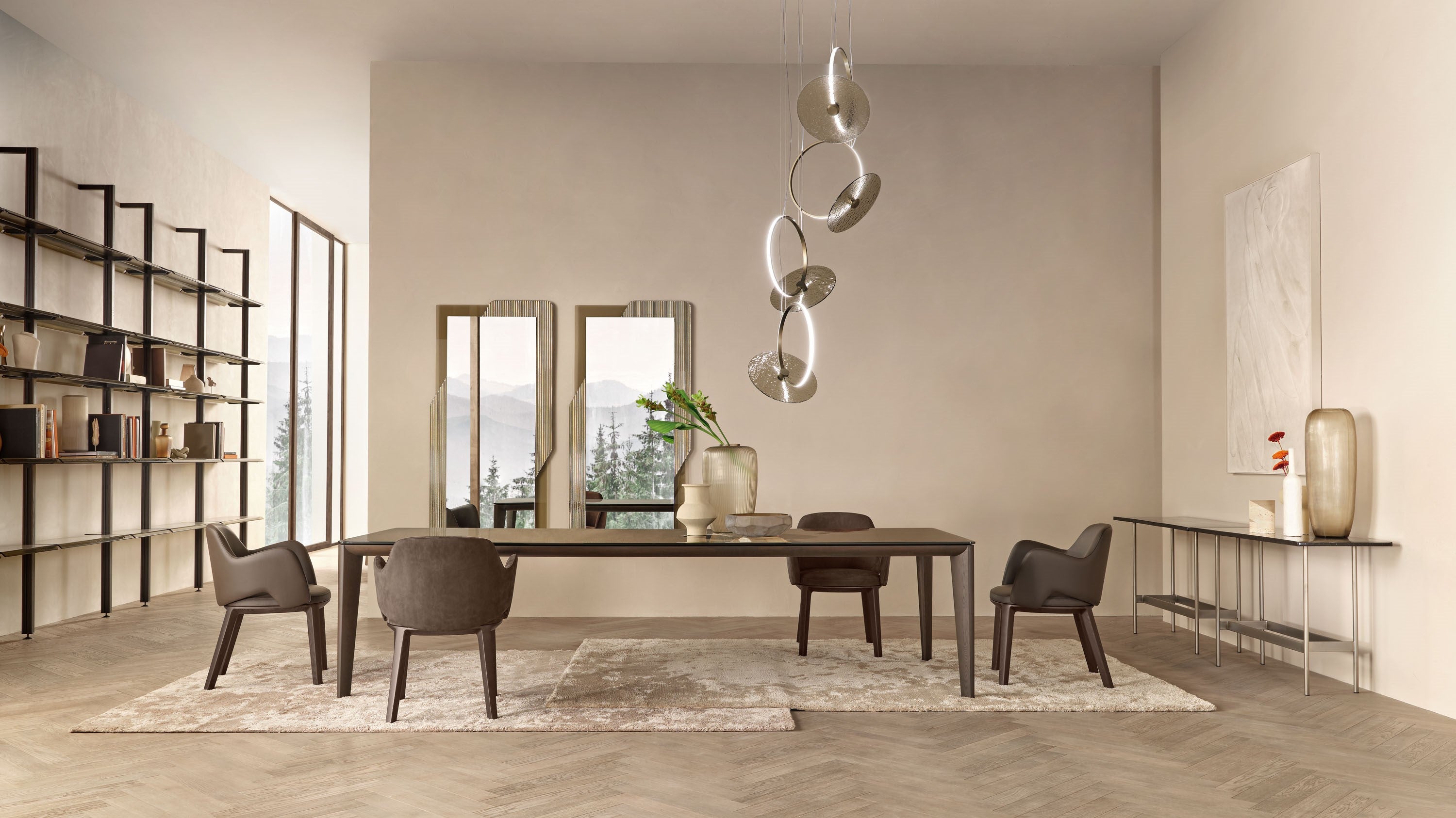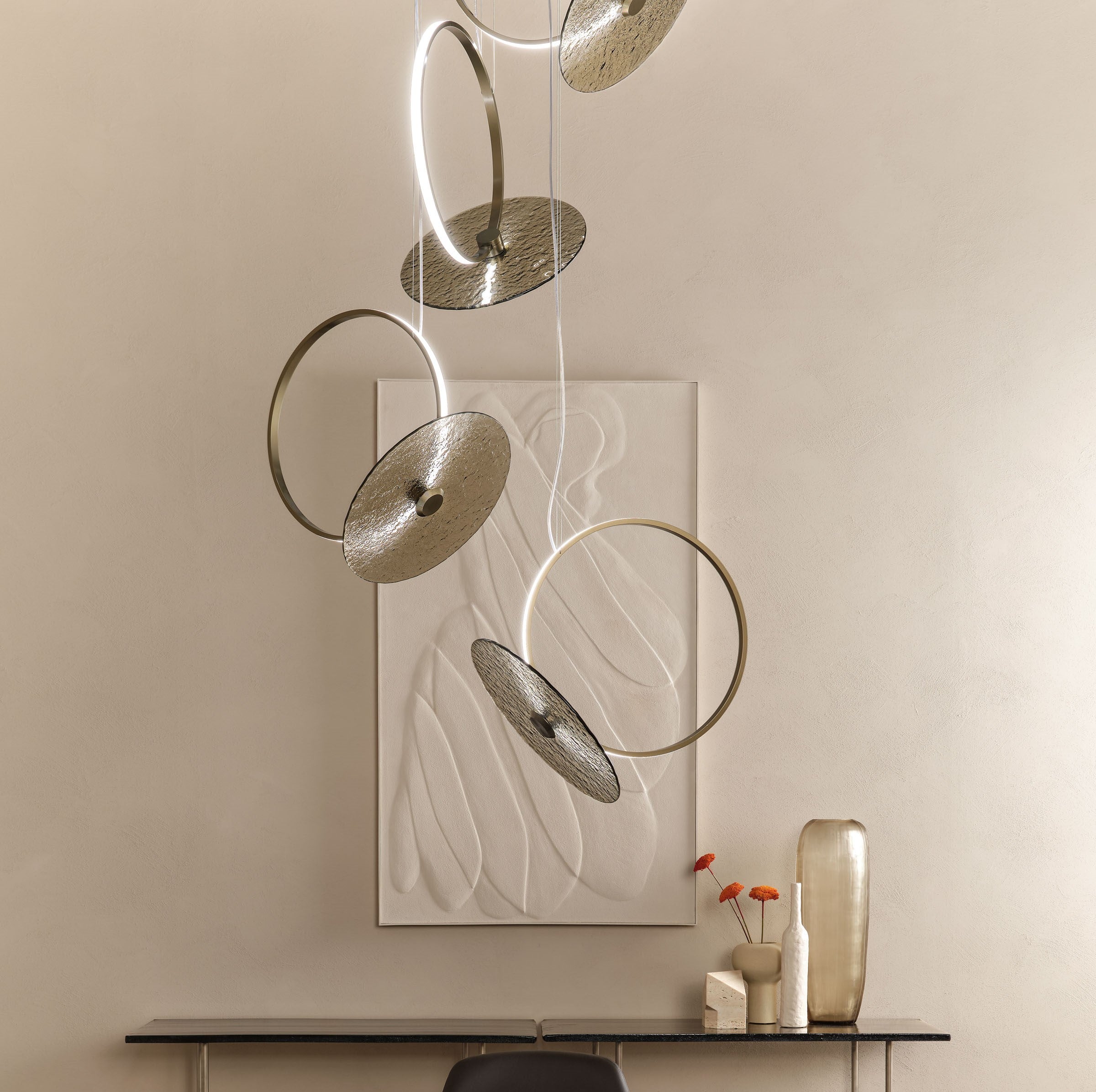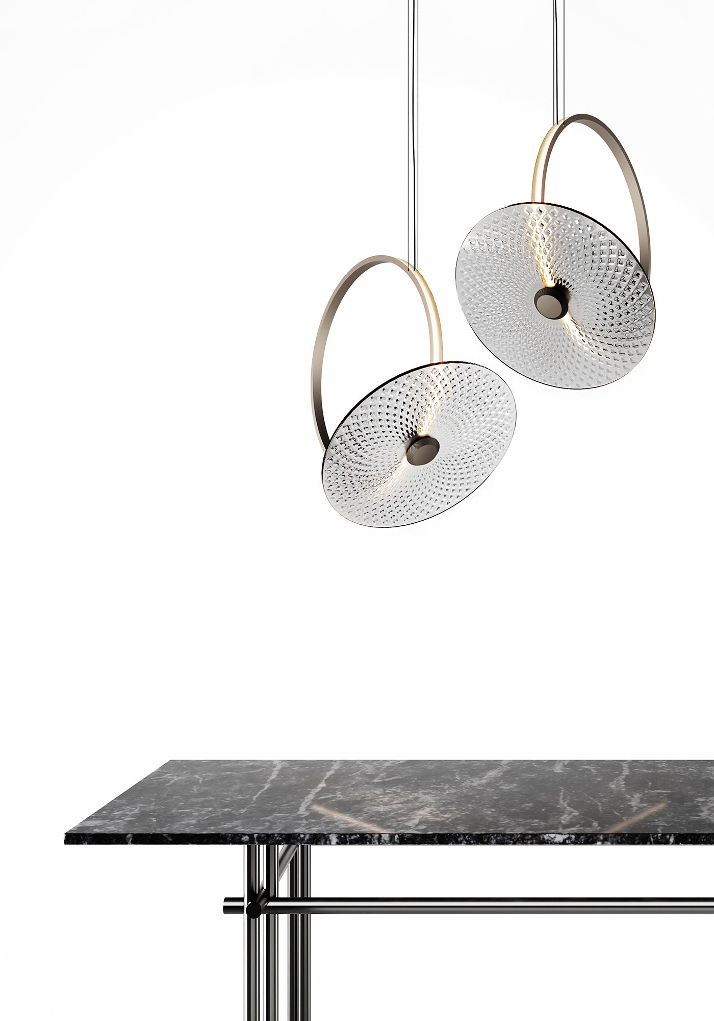 Designed by Davide Oppizzi for FIAM, Marry Me is conceived as a luminous composition rather than a conventional lamp. A suspended ring of light frames a hand-fused glass diffuser, creating a sense of motion, depth, and softness. Whether placed above a dining table, in a double-height living space, or as a dramatic focal point in a bedroom or lobby, Marry Me introduces a subtle theatricality rooted in contemporary Italian design.